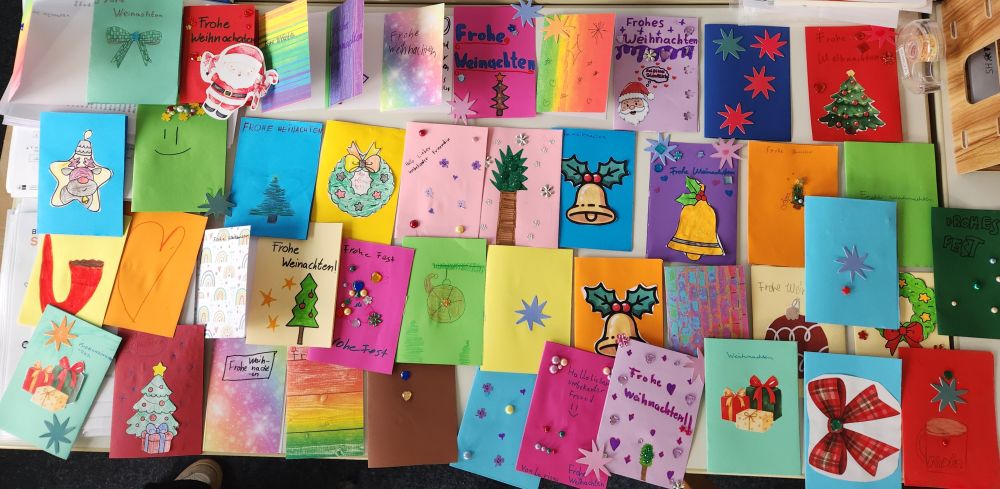 So bastelten die Schüler*innen mit viel Engagement und Liebe über 40 Weihnachtskarten an unbekannte Menschen in Altersheimen, die nun über den Hamburger Verein "Post mit Herz" als Weihnachtsgrüße verteilt werden. Sätze wie " Du bist nicht allein" und "Wir denken an Weihnachten an dich" werden hoffentlich einigen Menschen eine kleine Freude zu den Festtagen bereiten.