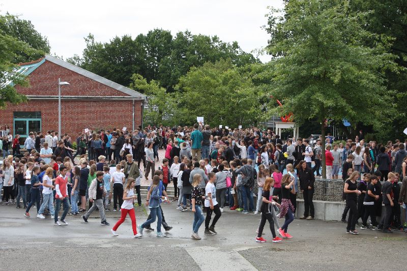 Das Ganze endete um 12 Uhr mit einem Flashmob aller Klassen auf dem Schulhof. Pünktlich dazu hatte es aufgehört zu regnen und ein paar Sonnenstrahlen erhellten diese tolle Gemeinschaftsaktion, die von Frau Becker organisiert worden war.