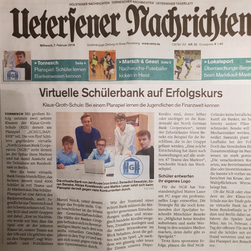 Die Uetersener Nachrichten berichteten bereits nach dem dritten Geschäftsjahr von dem Planspiel und der NORTH GERMAN BANK COOPERATION, die ab diesem Zeitpunkt auf ihrem Markt in Führung lag. Die Führung gab sie dann nicht mehr ab. Am Tag der offenen Tür am 16. Februar präsentierten einige Schülerinnen und Schüler der beiden 10. Klassen dem interessierten Publikum das Planspiel und die teilnehmenden Planspielbanken der KGST.Â